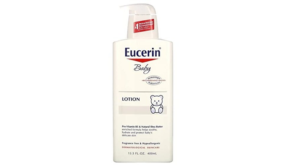 Eucerin Baby Lotion contains Pro-Vitamin B5 and Shea Butter. It is hypoallergenic and fragrance-free, making it gentle and safe for baby skin.