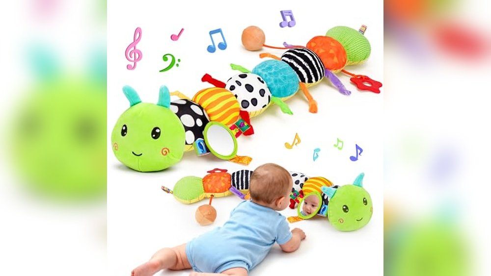 Plush caterpillars and multi-textured soft books are great. They encourage babies to lift heads, strengthening neck and shoulder muscles.