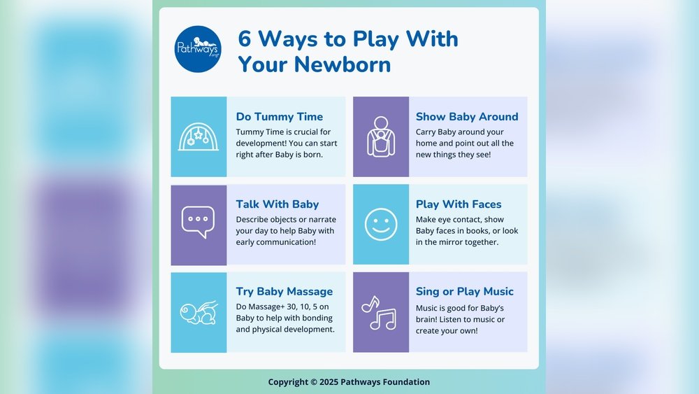 Start gentle activities like talking and touching from birth. More active play can begin around 6 weeks as your baby grows.